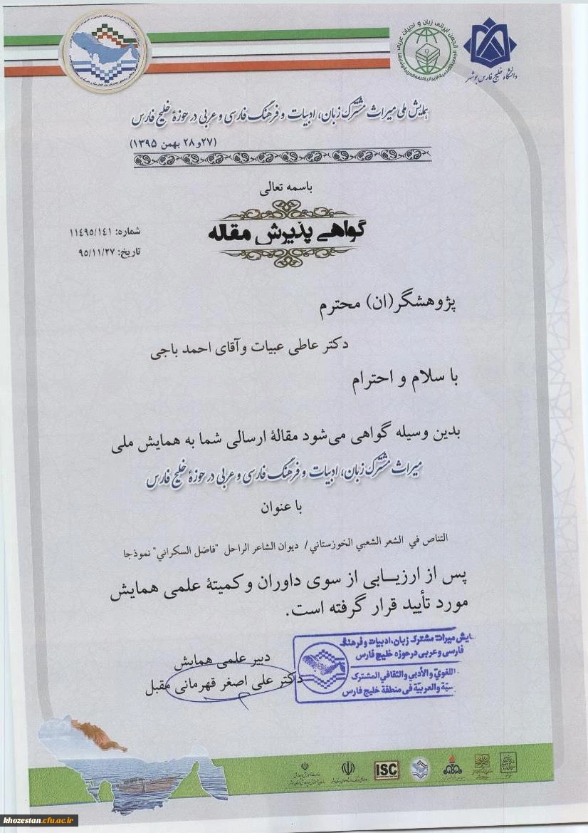 امتیاز دهید : گواهی پذیرش مقاله میراث مشترک زبان ، ادبیات و فرهنگ فارسی و عربی در حوزه خلج فارس چهارشنبه 24 خرداد 1396 ساعت 12:14