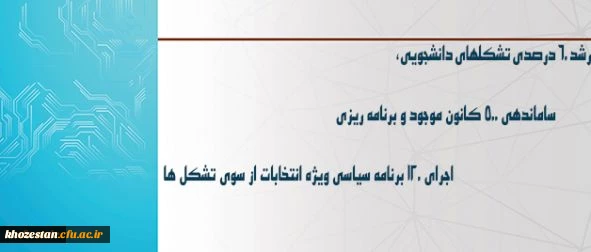 سرپرست معاونت فرهنگی اجتماعی دانشگاه خبر داد: رشد 60 درصدی تشکلهای دانشجویی، ساماندهی 500 کانون موجود و برنامه ریزی و اجرای 120 برنامه سیاسی ویژه انتخابات از سوی تشکل ها
