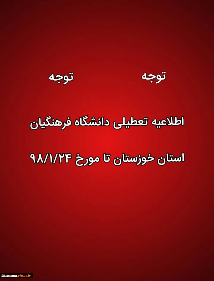 امتیاز دهید : تعطیلی کلاس های درس دانشگاه فرهنگیان استان خوزستان در پی وقوع سیبل پنجشنبه 15 فروردین 1398 ساعت 12:31