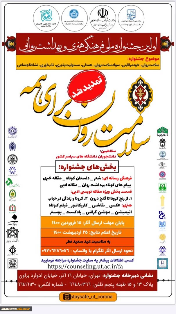 امتیاز دهید : جشنواره ملی فرهنگی، هنری و بهداشت و روانی دانشجویان دانشگاه های کشور 2 یکشنبه 17 اسفند 1399 ساعت 21:07