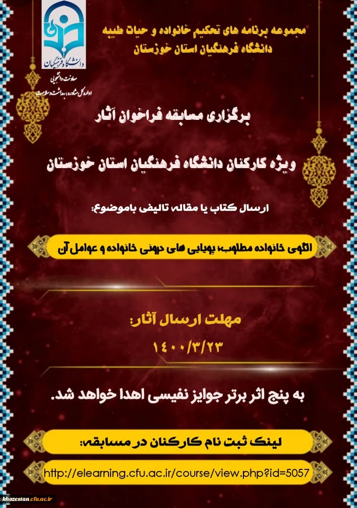 امتیاز دهید : برگزاری مسابقه فراخوان آثار ویژه کارکنان دانشگاه فرهنگیان استان خوزستان دوشنبه 17 خرداد 1400 ساعت 18:48