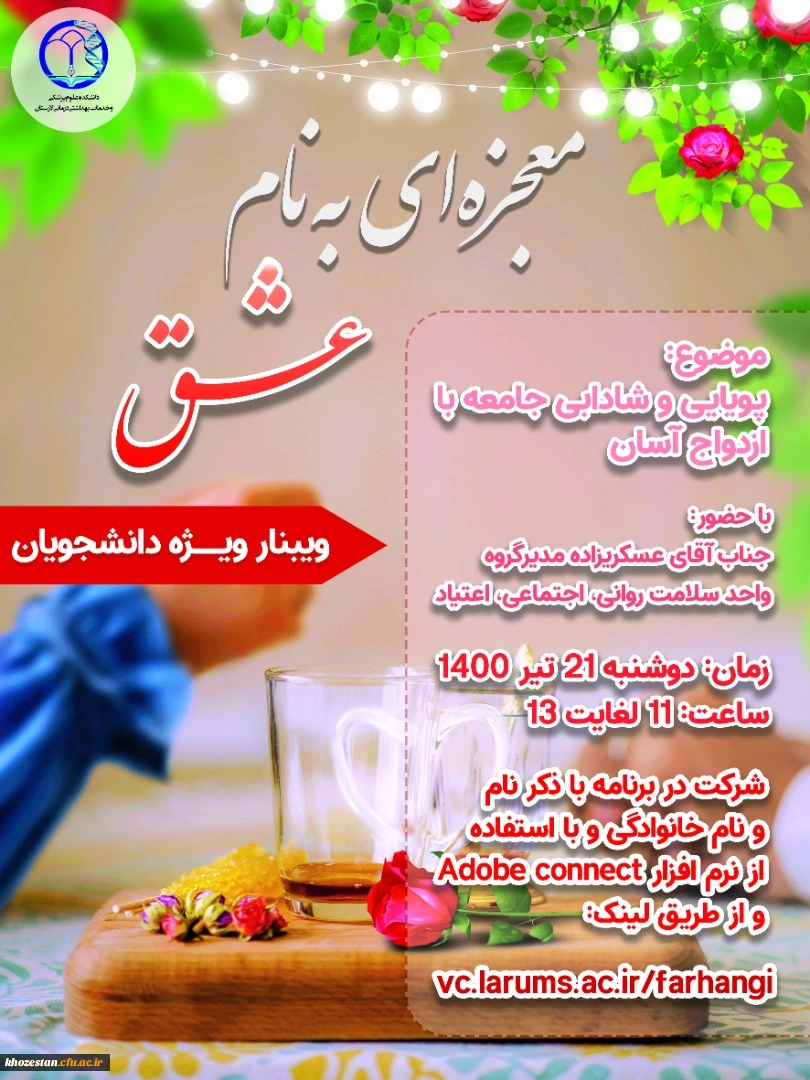 امتیاز دهید : وبینار ویژه دانشجویان با موضوع پویایی و شادابی جامعه با ازدواج آسان یکشنبه 20 تیر 1400 ساعت 15:45