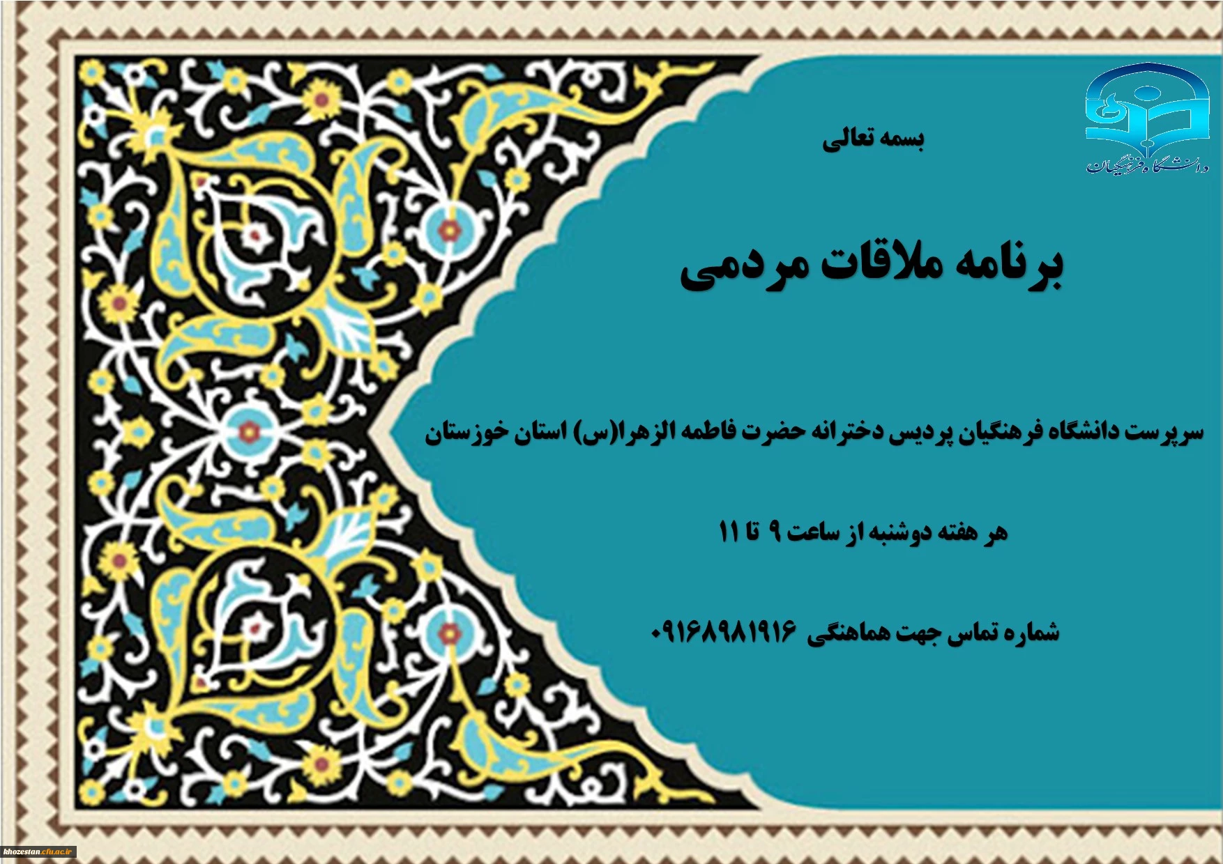 اعلام برنامه ملاقات مردمی با سرپرست دانشگاه فرهنگیان پردیس دخترانه حضرت فاطمه الزهرا(س) استان خوزستان