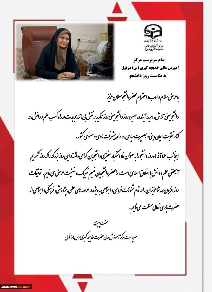 پیام تبریک سرپرست مرکز آموزش عالی حضرت خدیجه کبری (س) دزفول به مناسبت روز دانشجو 2