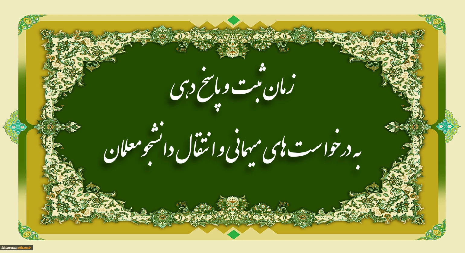 امتیاز دهید : اطلاعیه زمانبندی ثبت درخواست میهمانی دانشجومعلمان (نیمسال اول تحصیلی 1402-1401) 2 یکشنبه 22 خرداد 1401 ساعت 23:29
