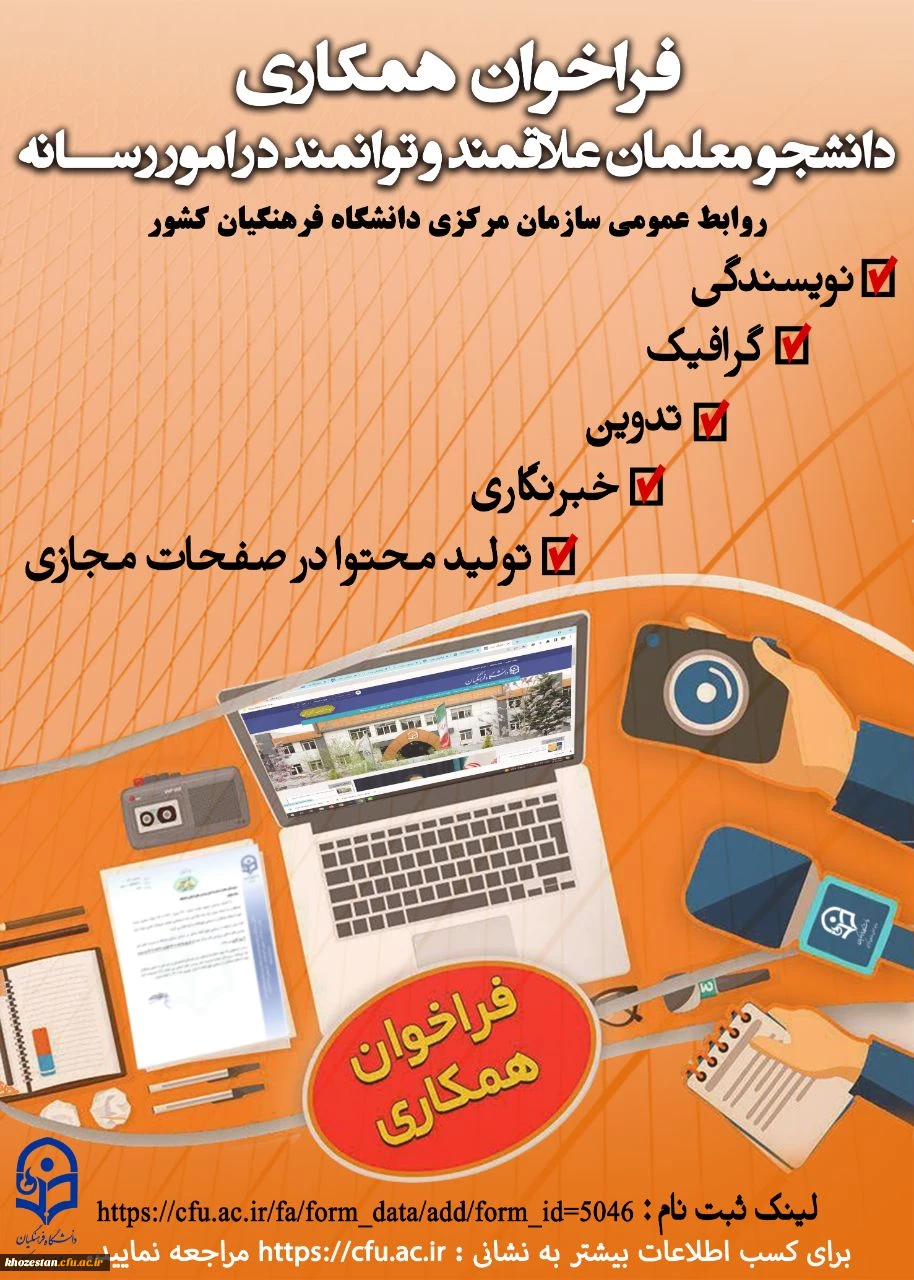 امتیاز دهید : فراخوان همکاری دانشجو معلمان علاقمند و توانمند در امور رسانه چهارشنبه 11 آبان 1401 ساعت 11:55