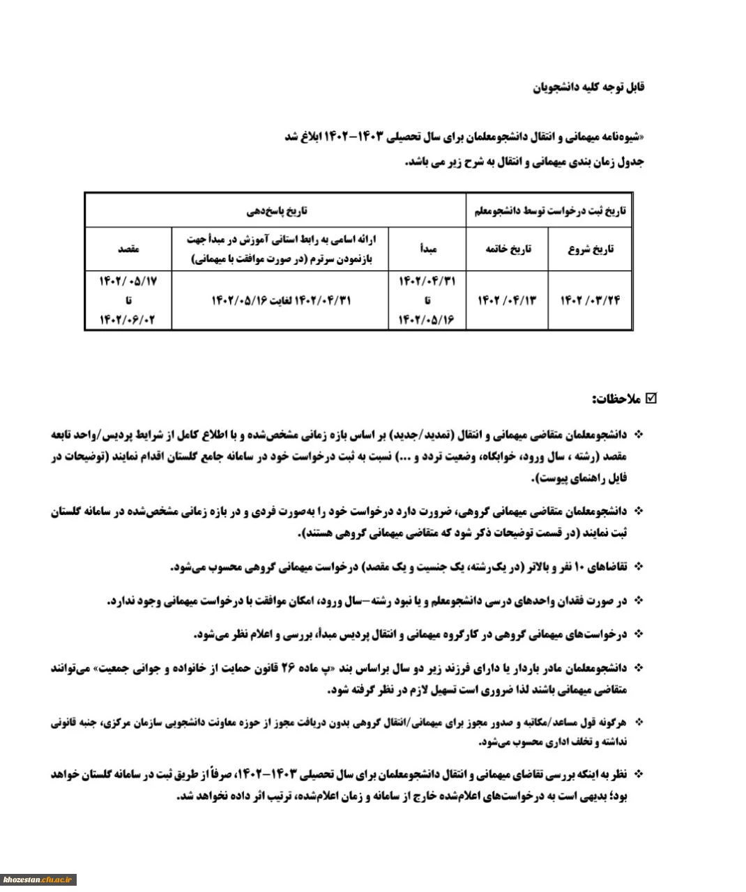 امتیاز دهید : شیوه نامه میهمانی و انتقال دانشجومعلمان برای سال تحصیلی 1403-1402 سهشنبه 23 خرداد 1402 ساعت 9:06