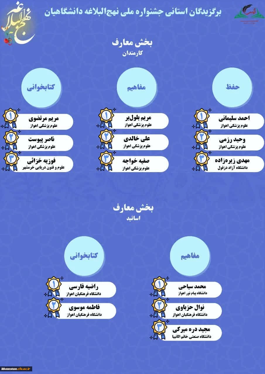 امتیاز دهید : دانشجویان دانشگاه فرهنگیان اهواز در جشنواره ملی نهج البلاغه درخشیدند. شنبه 8 دی 1403 ساعت 12:22